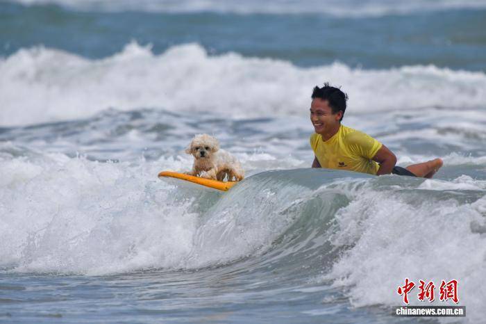 图为萌宠在万宁化身“冲浪高手”,踏浪前行,萌态百出,趣味十足。中新网记者 骆云飞 摄