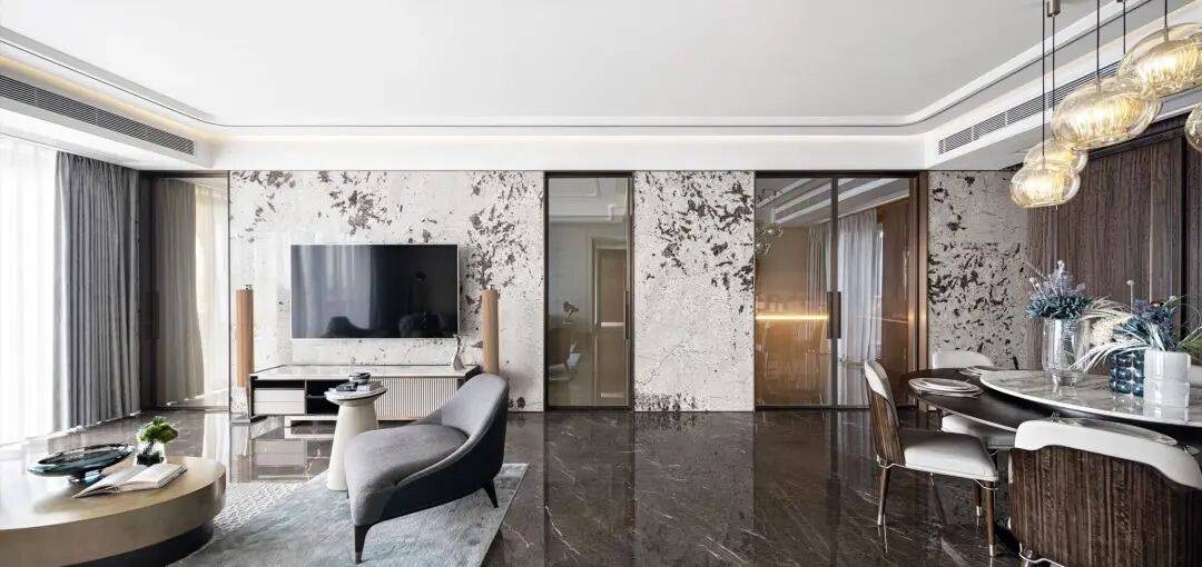 约 365㎡的悦岛组团环幕江景大平层,5 房双套房设计,双主题风格(美学简约与现代雅奢)的设计,自然与艺术交融,打造奢适空间品质范本。