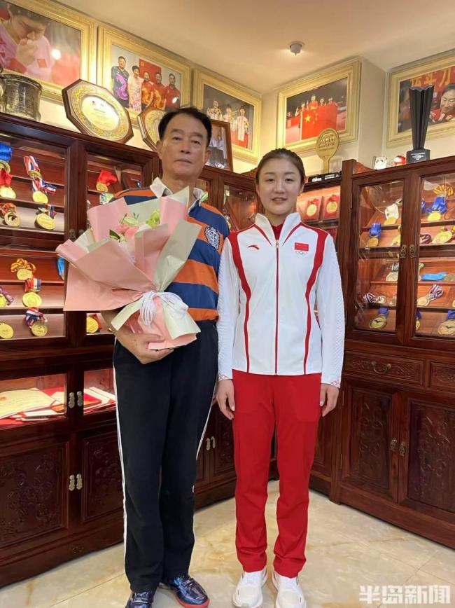 陈梦为恩师戴上奥运金牌,并感谢所有支持她的人。她表示,恢复训练后每天都在高强度训练中咬牙坚持,哪怕训练一整天后要做很久的康复治疗也没放松。她希望通过自己的努力和拼搏精神,影响年轻队员,把山东省乒乓球的传承接力下去。