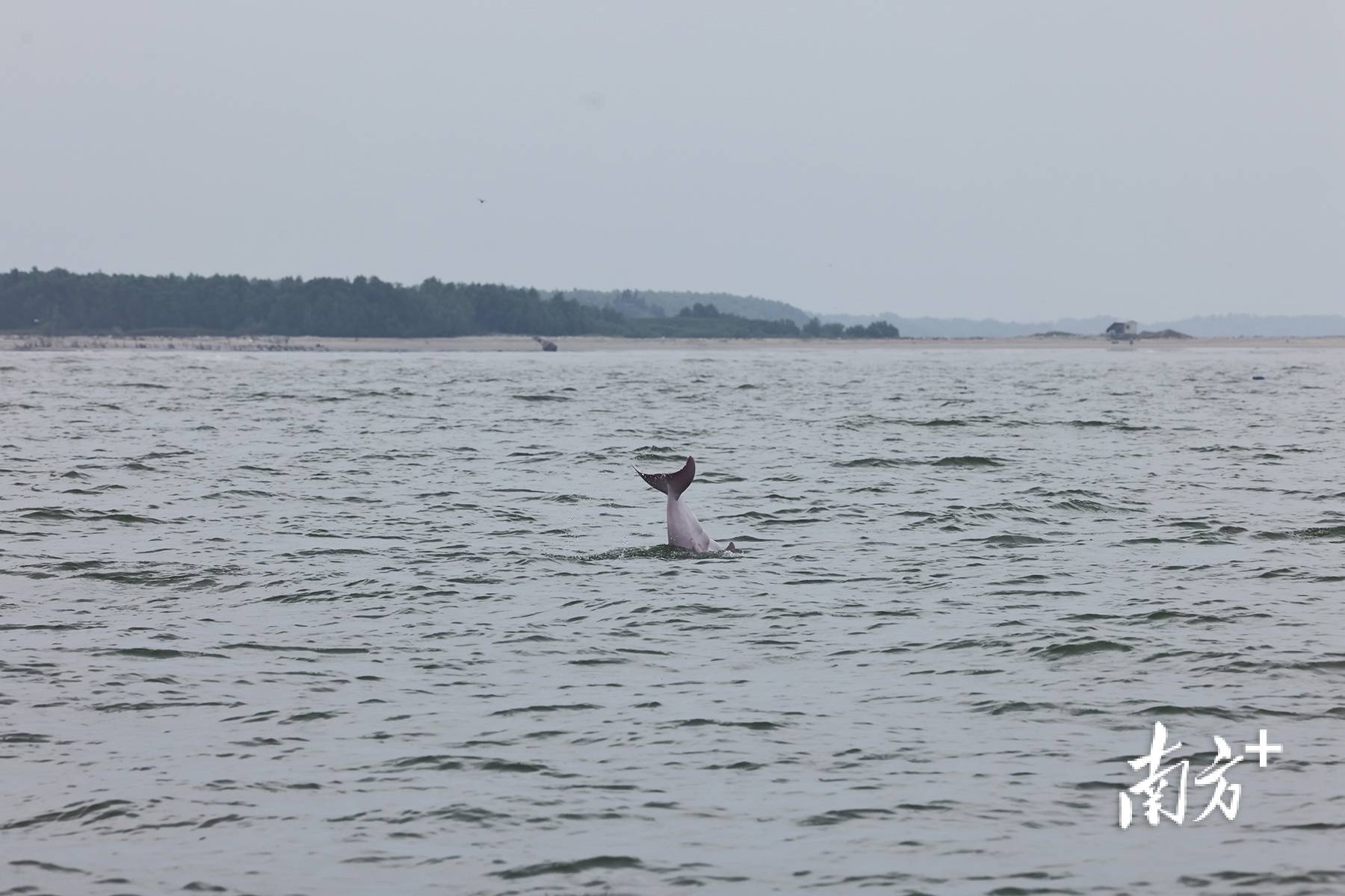 2025年10月31日,在汕头市培隆沙滩一带红树林附近海域,一头中华白海豚在游弋。