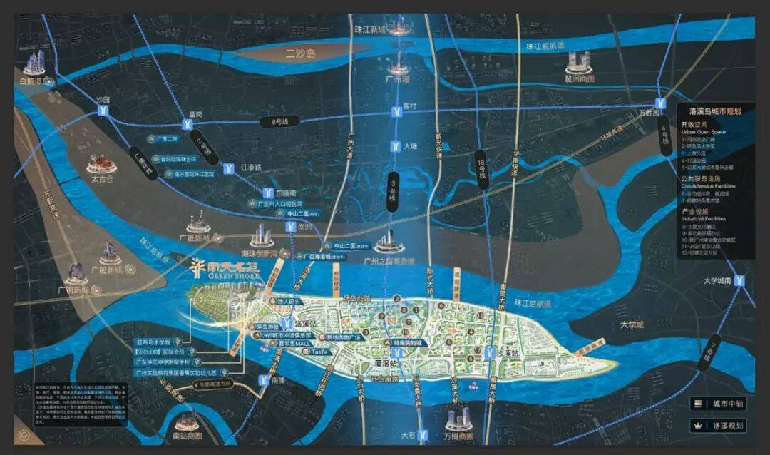 ①项目地处的洛溪岛,是继二沙岛之后,市中心第二个中轴岛,三江汇聚,处于城市中轴与珠江后航道的交汇处;