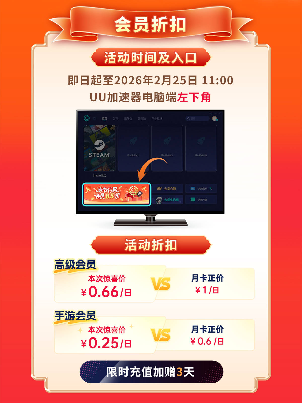 为保障玩家在春节期间顺畅游戏,UU加速器推出了新春限时优惠活动。自2026年2月13日至2月25日,用户可享受直充会员8.5折专属折扣,最高可省下43元,还能随机获得额外时长。这样一来,玩家用更实惠的价格即可获取专业加速服务,显著提升假期的游戏乐趣。